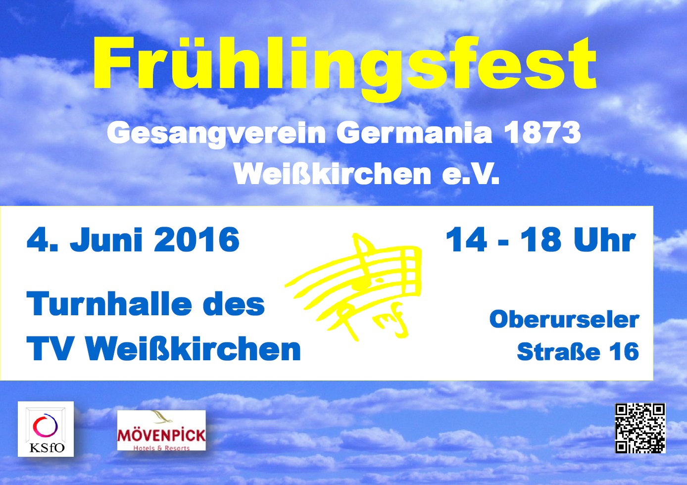 Verbringen Sie am 4.6. einen fröhlichen Frühlingstag mit den Chören des Gesangvereins Germania Weißkirchen und feiern Sie mit uns.