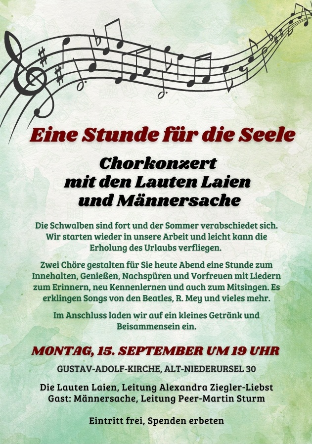 Wann 15. September 2025 19:00 Zum Kalender hinzufügen ICS herunterladen Google Kalender iCalendar Office 365 Outlook Live Wo Gustav-Adolf-Kirche Alt-Niederursel 30, Frankfurt Unser Männerchor Männersache tritt beim Konzert der Lauten Laien auf.